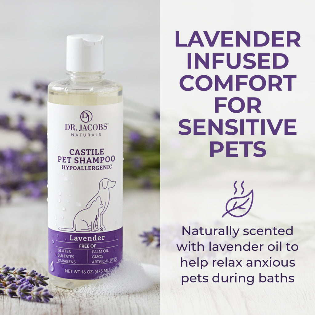 Bring peace and comfort to bath time with our Castile Pet Shampoo in Lavender. Specially crafted with natural, plant-based ingredients, this gentle formula cleanses thoroughly while being kind to sensitive skin and coats. The soft, soothing aroma of lavender helps calm your pet, making every wash a relaxing and enjoyable experience.